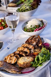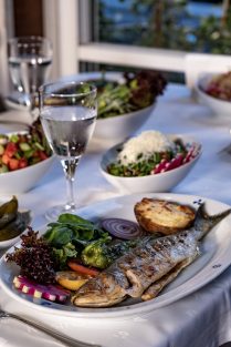 Tam mevsiminde doğru zamanda ve doğru boyda avlanan lüfer veya palamudun yanında özel salatasından oluşuyor.
